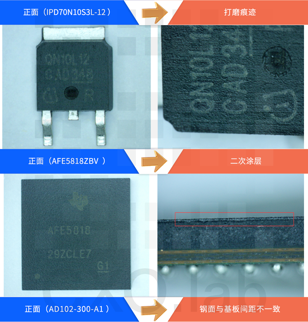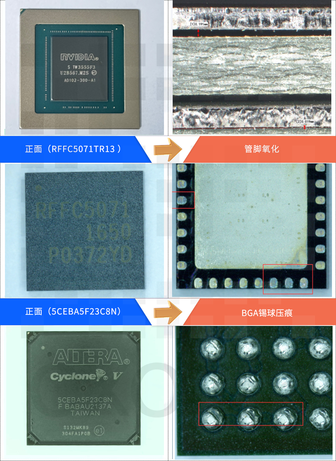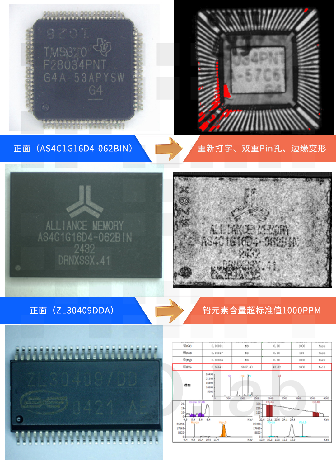 外觀檢測是指確認(rèn)收到的芯片數(shù)量、內(nèi)包裝、濕度指示、干燥劑要求和外包裝是否符合要求。單個(gè)芯片的外觀檢測主要包括:芯片的打字、年份、原產(chǎn)地、是否重新涂層、管腳的狀態(tài)、是否有重新打磨痕跡、不明殘留物、以及廠家logo的位置等。